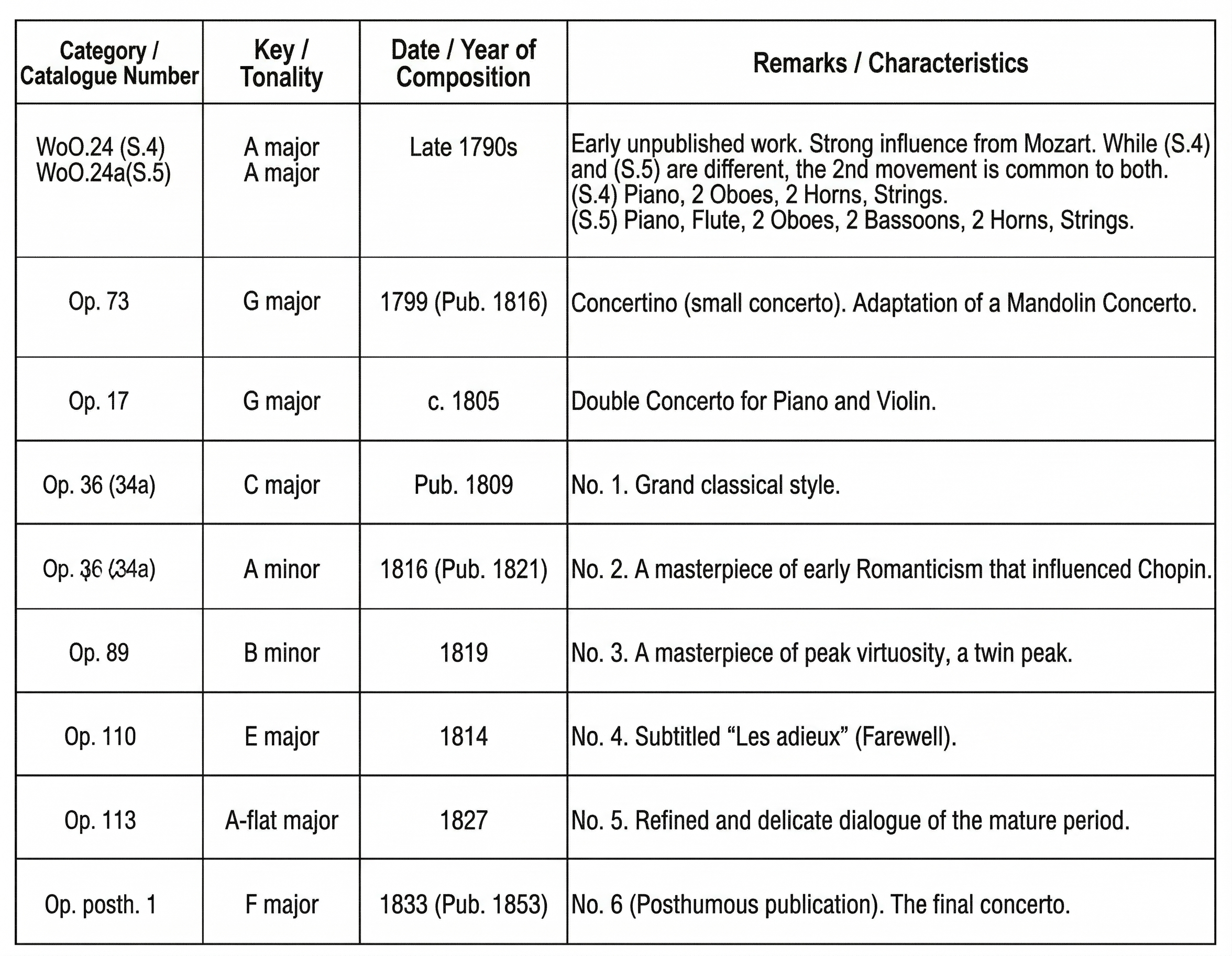 Throughout his life, Johann Nepomuk Hummel composed numerous works for piano and orchestra. In addition to the officially numbered piano concertos, his output includes early works and pieces published posthumously. Taken together, his principal concertos may be outlined as follows. The following survey examines these works in chronological order and according to their opus numbers.